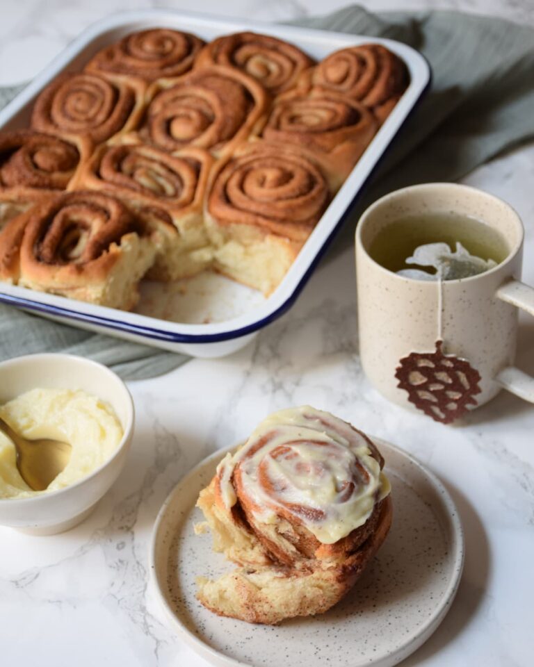 - Préchauffez le four à 175 °C, puis glissez-y le plat pour environ 20 minutes, jusqu’à ce que les cinnamon rolls soient bien dorés.