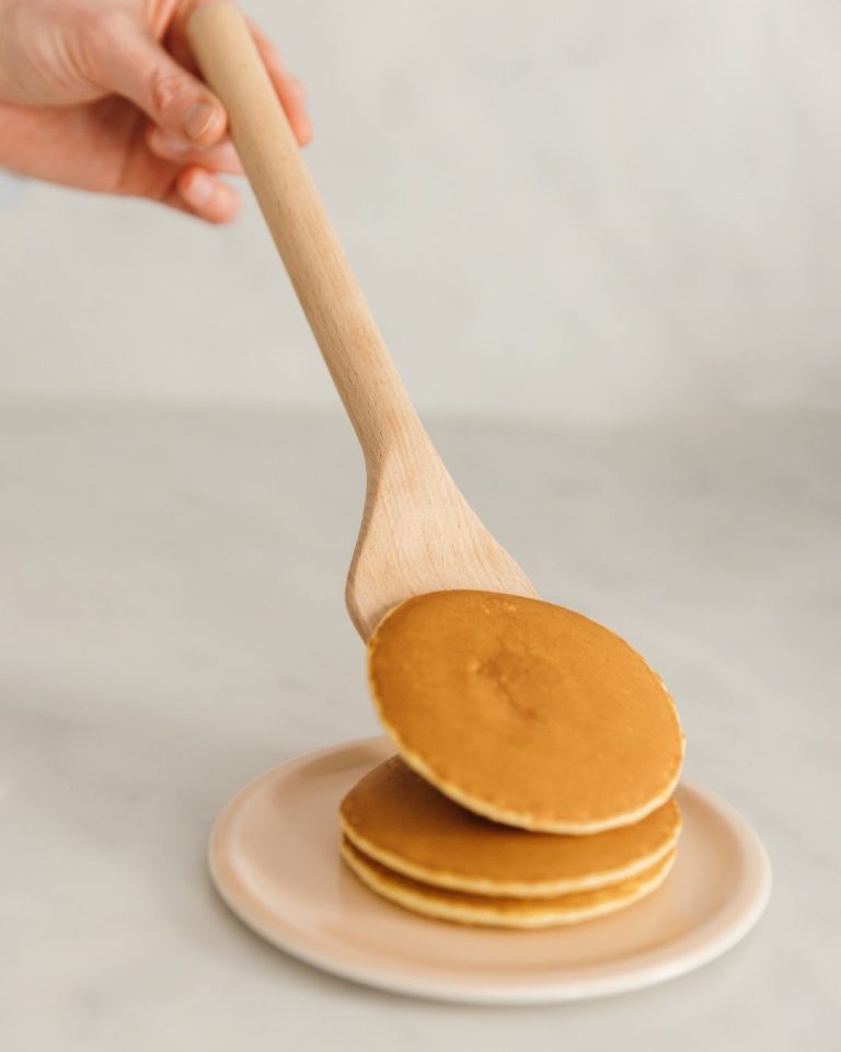 - Faites chauffer votre poêle puis graissez-la. Lorsque la poêle est bien chaude, déposez une petite louche de pâte et faire cuire 30 secondes de chaque côté environ. Aidez-vous de la Palette Coudée pour les retourner facilement.