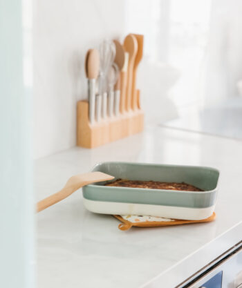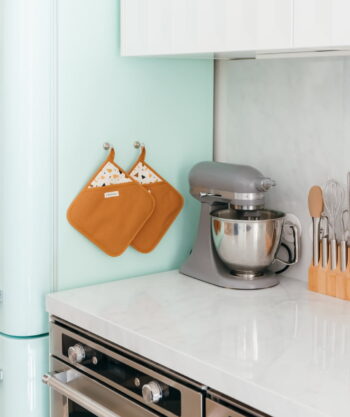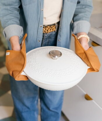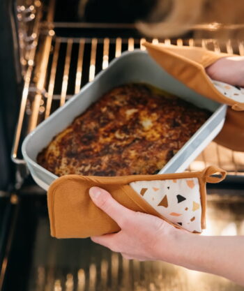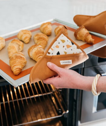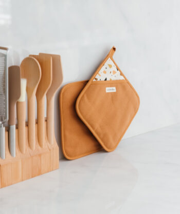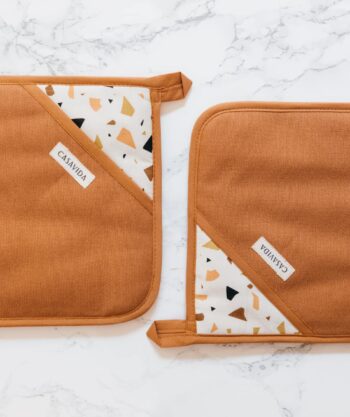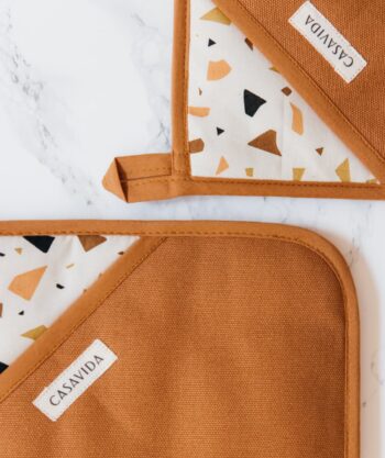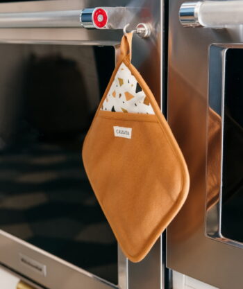 • Design : Exit les maniques moches planquées au fond d’un tiroir ! Avec leur jolie teinte caramel et leur motif terrazzo signature, ces maniques deviennent un vrai accessoire déco. Douces, stylées, élégantes… elles s’affichent fièrement dans votre cuisine, tout en se rendant utiles au quotidien.