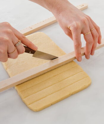 • Réglettes multi-usage qui peuvent aussi être utilisées pour rassembler la pâte en rectangle ou couper des bandes de pâte de 2cm de large
