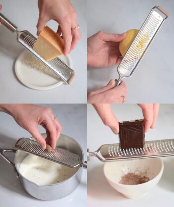 - Pour zester les agrumes et râper le gingembre, l’ail, le parmesan et autres fromages à pâte dure, le chocolat, les épices (muscade, bâtons de cannelle, fève de tonka), les truffes…