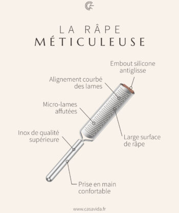 - Disposition incurvée des micro lames facilitant l’accroche de l’ingrédient à râper