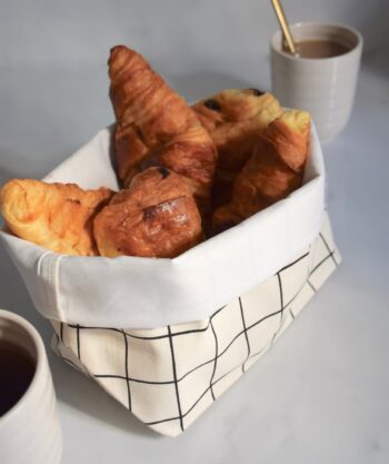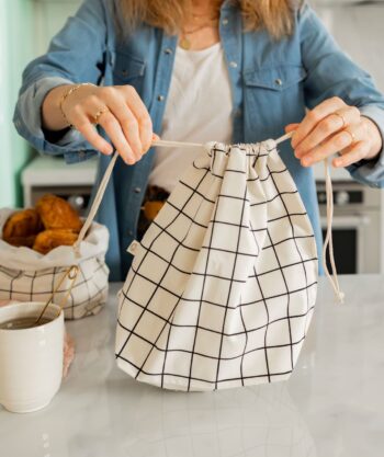 « Après le succès de l'Etui à Baguettes, il fallait un sac à pain pour compléter. C'est grâce aux discussions avec vous qu'on a aboutit à la taille idéale de la Sache à Pain! Parfaite pour un pain ou une belle fournée de viennoiseries. Perso j'en ai 2 pour notre pain complet tranché et nos viennoiseries du dimanche. Ca change tout côté conservation, les croissants sont toujours moelleux le lendemain! Et on adore la poser direct sur la table du brunch. »