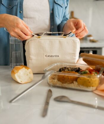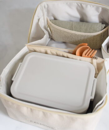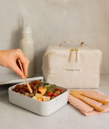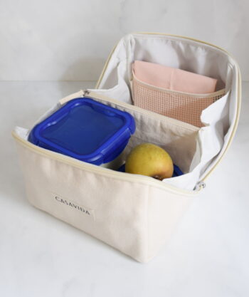 J'adore son rendu trop beau avec la poignée à carreaux Casavida et c'est un vrai plaisir pour organiser les produits qu'on y glisse! Je n'en ai personnellement pas besoin pour le déjeuner mais je l'utilise déjà pour les goûters des enfants. J'aurais adoré l'avoir pour transporter les repas de bébé pendant la diversification."
